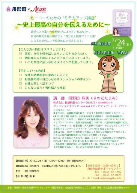 こんにちは^^梅雨も中休みでしょうか、晴天とはいきませんが曇り空の舟形町です…もうすぐ夏本番!!!皆さんの男力をアップしませんか?〜史上最高の自分を伝えるために〜モテ力アップ講座!!日時 :平成28年7月24日(日) 10:00〜12:00開催場所:舟形町内 ※お申込みいただいた方にご案内します。対象 :町内外問わず婚活中の独身男性参加費 :無料講師 :株式会社結婚情報センターNozze代表取締役社長 ファッションブランド Juvi Juviオーナーデザイナー 須野田 珠美(すのだ たまみ)氏婚活もお仕事も一生懸命頑張っているあなたへ自分の魅力を最大限に伝え”自分史上最高にモテる男”になるためのコツを具体的にお伝えします!!”常に婚活業界の最前線を走り続けるNozze”だからこそあなたにとっておきのアドバイスを教えてくださいます(●´ω`●)町外の方は事前にお問合せください^^?舟形町結婚サポートセンター TEL:0233-32-1152 Mail:funakon@funagata.info本格的な婚活シーズンを迎える前にあなたの”男”を磨きましょう!!!