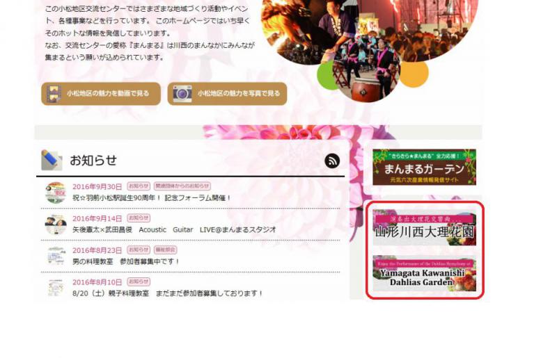 新聞紙上では連日「インバウンド」関連情報が掲載されており、山形県では特に「台湾交流」が積極的に展開されております。当交流センターでも、地域情報発信の一環としてホームページトップに「中国語及び英語」表記の...「川西ダリヤ園」のPRページを作成いたしました。今後の川西町のインバウンド事業の一助となれば幸いです。是非ご覧くださいますようご案内申し上げます。★サイト情報:http://komatsu-manmaru.com/