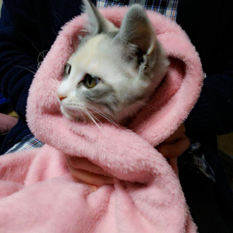 お気に入りの、ピンクのフリースに巻かれぬくぬくのにこちゃん♪