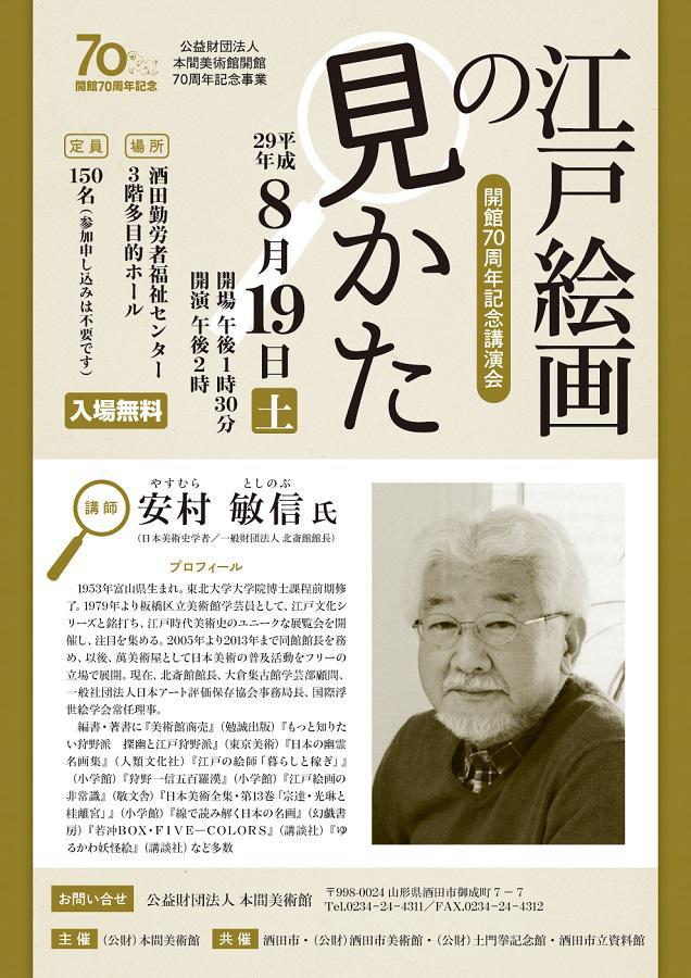 当館の開館70周年記念特別展「江戸絵画の魅力」に関連し、日本美術史学者の安村敏信氏を講師にお迎えする講演会「江戸絵画の見かた」を開催します。 江戸時代という約260年の間に起きた絵画史の大きな流れを知り、個性豊かで多彩な表現が生み出された江戸絵画をもっと楽しみましょう! 開館70周年記念講演会「江戸絵画の見かた」 講師:安村敏信氏(日本美術史学者/一般財団法人 北斎館館長)日時:8月19日(土)午後2時〜会場:酒田勤労者福祉センター定員:150名(予約は不要)主催:(公財)本間美術館主催:酒田市・(公財)酒田市美術館・(公財)土門拳記念館・酒田市立資料館お問い合わせ:本間美術館事務局 0234-24-4311