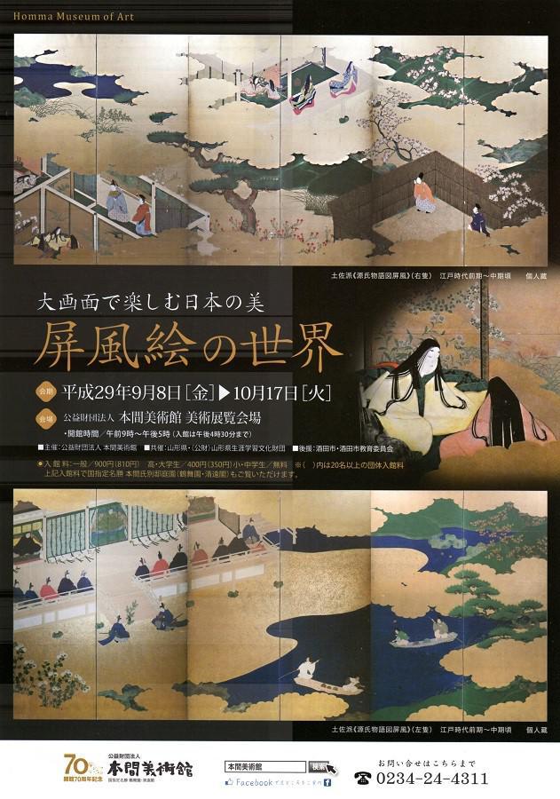 9月8日(金)より、企画展「大画面で楽しむ日本の美 屏風絵の世界」が開催されます。 日本における屏風の歴史は古く、奈良時代にまで遡ります。平安・鎌倉時代には、風や視線を遮るとともに、室内の装飾として欠かすことのできない調度品となりました。桃山から江戸時代は、屏風は鑑賞絵画として需要が高まり、大画面を活かした様々な作品がつくれています。明治時代以降になると、生活スタイル変化から生活の中から屏風が姿を消していきます。しかし、「展覧会」という作品発表の場ができたことで絵画の一形態として屏風絵は描かれ続けているのです。 本展では、初公開となる源氏物語図屏風(個人蔵)をはじめ、本間家ゆかりの谷文晁の四季山水屏風や近代日本画の巨匠・竹内栖鳳の巨大な富士図屏風など、迫力と見どころの多い屏風絵を7点ご紹介します。