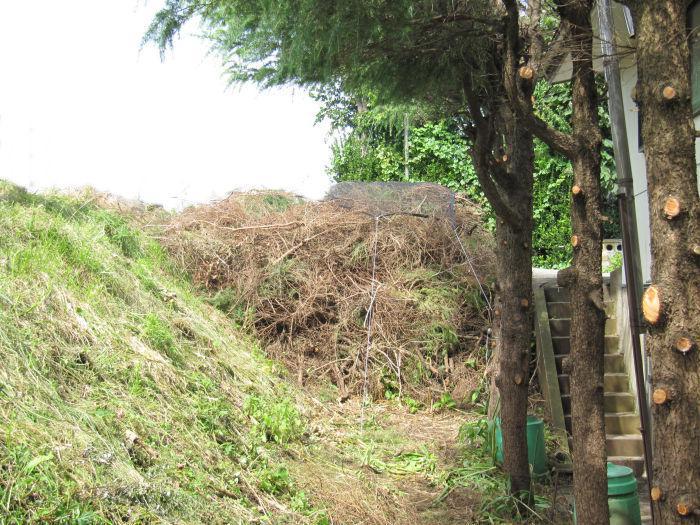 切った枝が大量に発生して、さてどう処分したらいいか考えています。道路の高さよりも高くなっています。