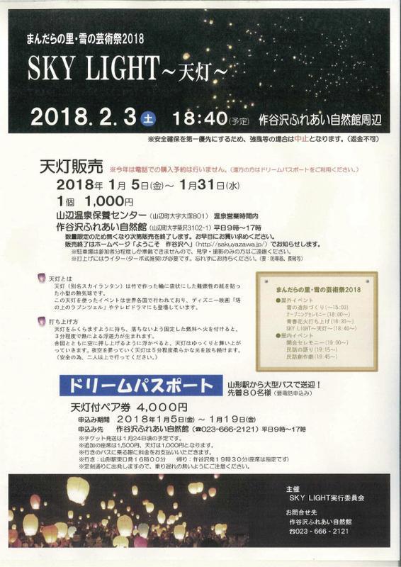山辺町作谷沢の冬のイベント『まんだらの里・雪の芸術祭2018』を開催します。屋外イベントの一つ、天灯(スカイランタン)の打ち上げの参加者を募集します!(^^)!作谷沢の澄んだ夜空に、色とりどりの天灯が舞い上がり幻想的な風景となります。点灯に願いを込めて一緒に打ち上げに参加してみませんか!その他、屋内イベントでは民話の語りや創作劇等も楽しむことができます。また、山形駅から会場までバスで送迎してくれる『ドリームパスポート』を発売いたします。雪道の運転に不安な方や、交通手段が無い方からも安心してご参加いただけます。☆開 催 日 2018年2月3日(土) オープニングセレモニー 18:00〜 天灯打ち上げ 18:40〜☆場 所 作谷沢ふれあい自然館☆参 加?費 天灯(スカイランタン)1個1,000円☆天灯販売 2018年1月5(金)〜1月31日(水) 山辺温泉保養センター (温泉営業時間内) 作谷沢ふれあい自然館 (平日9時〜17時) ※数量限定のため無くなり次第終了します。お早目にお買い求めください。 ※打上げにはライター(ターボ式推奨)が必要です。忘れずにお持ちください。☆ドリームパスポート 点灯1個付ペア券 4,000円 ■申込み期間 2018年1月5日(金)〜1月19日(金) ■申込み先 作谷沢ふれあい自然館 TEL023-666-2121(平日9時〜17時) ※先着80名様限定になります。 ※行き:山形駅東口発16:00、帰り:作谷沢発19:30(座席指定)?☆お問合せ先 作谷沢ふれあい自然館 山辺町大字簗沢3102−1 TEL 023−666−2121