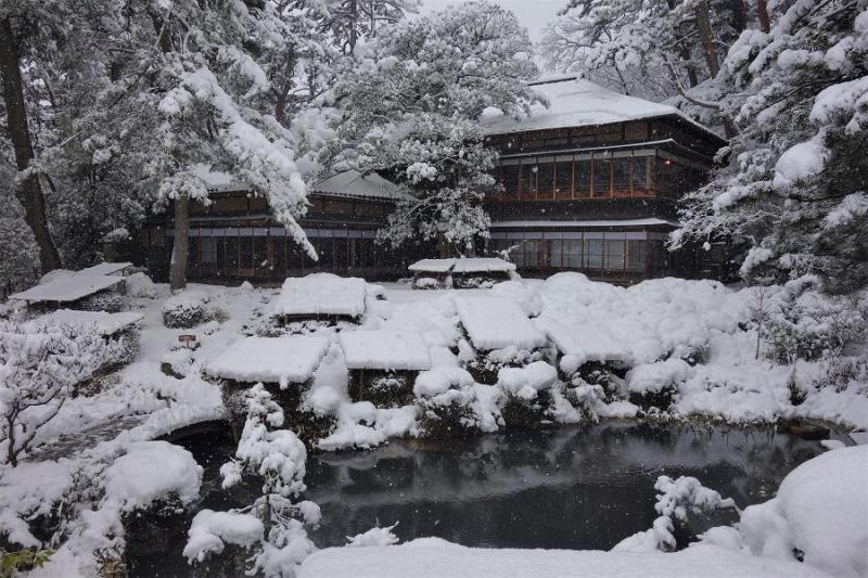 本日、1月11日より本間美術館の2018年がスタートしました! 初日は写真のように本格的な雪となりました。これから2月いっぱい頃まで、雪化粧した美しい庭園をご覧いただけます。 庭園内にある清遠閣からも、静寂に包まれた庭園をご覧下さい。 四季を通じて楽しめる庭園を有する本間美術館を、本年もよろしくお願いいたします。