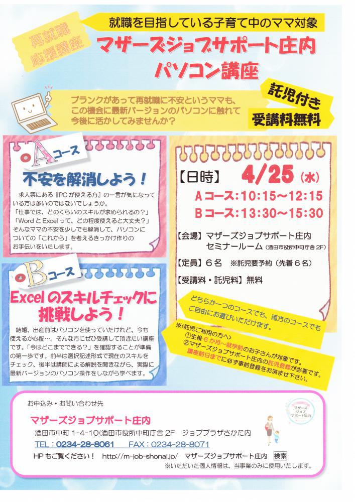 ☆マザーズジョブサポート庄内主催☆再就職応援 『パソコン講座』のお知らせ ◇Aコース◇ 4月25日(水)10:15〜12:15 『不安を解消しよう!』 「求人票の"パソコンが使える方"ってどの程度?」 「仕事では、どのくらいのパソコンのスキルが求められるの?」 「WordとExcelって、どの程度使えると大丈夫?」と いろいろな不安がありますよね… パソコンについての"これから"を考えるきっかけに♪ ◇Bコース◇ 4月25日(水)13:30〜15:30 『Excelのスキルチェックに挑戦しよう!』 「以前はパソコンを使っていたけど、今も使えるのか心配…」 現在、どこまでできるのかを 確認することが準備の第一歩です。 前半はExcelのスキルチェック、 後半は講師による解説を聞きながらの操作になります。 ♪片方のコースのみ、両方のコースの受講どちらでもOKです♪ 【駐車場について】お車でお越しの際は、中町庁舎脇にある〈セントラルホテル契約駐車場〉をご利用ください。(ジョブプラザさかたと表示してあります。)※契約駐車場が満車の場合は、酒田市中央地下駐車場をご利用ください。地下駐車場をご利用の方は、無料駐車券(最大2時間)を発行いたします。お帰りの際に、コンシェルジュ窓口へお声がけください。 ◇お申込み・お問い合わせ◇マザーズジョブサポート庄内TEL:0234-28-8061