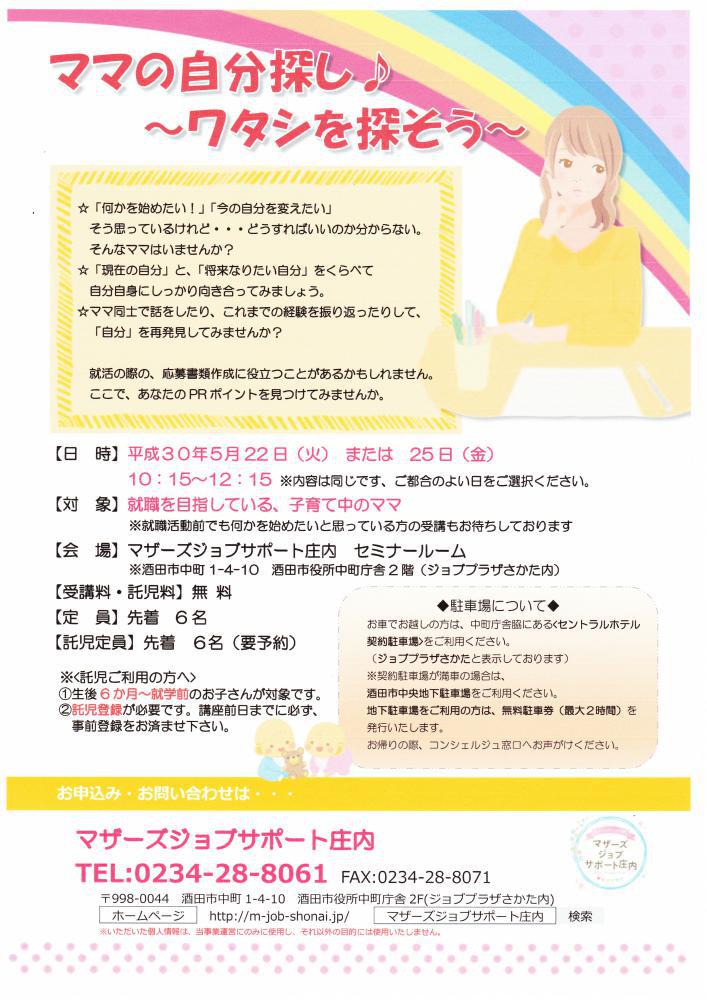 『そろそろ何か始めたい』『今の私にできることは何かな?』『今の自分を変えるにはどうしたらいいの?』そんなママにオススメします。「自分の好きなこと」「得意なこと」「これまでの経験からできること」を振り返り自分自身と向き合ったり、ママ同士でお話をしながら、"これから"を考えるキッカケにしてみませんか? 【日 時】5月22日(火)または25日(金) ※好きな日にちをお選びください。内容は同じです。【対 象】就職を目指している子育て中のママ ※就職活動前で何かを始めたい方でもOK【会 場】マザーズジョブサポート庄内 セミナールーム【受講料・託児料】無料【定員】先着6名【託児定員】先着6名※事前登録・予約が必要です。 ※併設の託児ルームで、保育スタッフがお子さんを お預かりします。ママは安心して受講いただけます。 【駐車場について】 お車でお越しの際は、中町庁舎脇にある 〈セントラルホテル契約駐車場〉をご利用ください。 (ジョブプラザさかたと表示してあります。) ※契約駐車場が満車の場合は、 酒田市中央地下駐車場をご利用ください。 地下駐車場をご利用の方は、無料駐車券(最大2時間)を 発行いたします。 お帰りの際に、コンシェルジュ窓口へお声がけください。 ◇お申込み・お問い合わせ◇マザーズジョブサポート庄内TEL:0234-28-8061