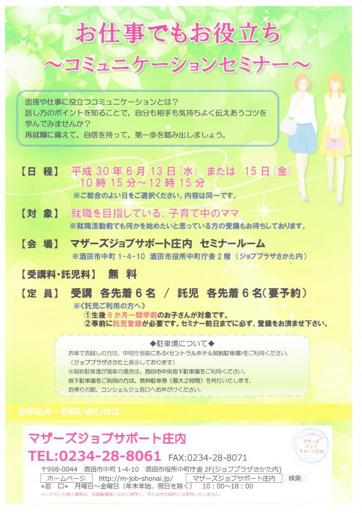 面接や仕事に役立つ『コミュニケーション』とは?話し方のポイントを知ることで、自分も相手も気持ちよく伝えあうコツを学んでみませんか? ワークを通して『コミュニケーション』について一緒に考えてみましょう。 【日 時】6月13日(水) または 15日(金) 10時15分〜12時15分 ※都合の良い日をお選びください。内容は同じです。【対 象】就職を目指している子育て中のママ ※就職活動前で何かを始めたい方でもOK【会 場】マザーズジョブサポート庄内 セミナールーム【料 金】受講料 及び 託児料 無料【定 員】先着6名 ※お申込みが必要です。【託 児】定員6名 ※事前登録・予約が必要です。 ※併設の保育ルームで、保育スタッフがお子さんを お預かりします。ママは安心して受講いただけます。 【駐車場について】 お車でお越しの際は、中町庁舎脇にある 〈セントラルホテル契約駐車場〉をご利用ください。 (ジョブプラザさかたと表示してあります。) ※契約駐車場が満車の場合は、 酒田市中央地下駐車場をご利用ください。 地下駐車場をご利用の方は、無料駐車券(最大2時間)を 発行いたします。 お帰りの際に、コンシェルジュ窓口へお声がけください。 どうぞ、お気軽にお問い合わせくださいね。 ◇お申込み・お問い合わせ◇マザーズジョブサポート庄内TEL:0234-28-8061