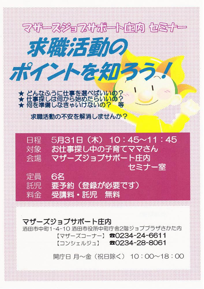 5月『マザーズジョブサポート庄内 求職支援セミナー』『求職活動のポイントを知ろう!』を行います! このセミナーは仕事を選ぶ際のポイントを学ぶことができます!! ★どんなふうに仕事を選べばいいの?★仕事探しは何から始めたらいいの?★何を準備しなきゃいけないの? など求職活動の不安を解消しませんか? ハローワークマザーズコーナーでは定期的にセミナーを開催します。奮ってご参加下さい。受講後も疑問点など、窓口にてご相談が受けられます。☆雇用保険受給者の方は求職活動実績にカウント出来ます☆ 【日 時】5月31日(木) 10時45分〜11時45分【対 象】お仕事探し中の子育てママさん【会 場】マザーズジョブサポート庄内 セミナールーム【料 金】受講料 及び 託児料 無料【定 員】先着6名 ※お申込みが必要です。【託 児】定員6名 ※事前登録・予約が必要です。 ※併設の保育ルームで、保育スタッフがお子さんを お預かりします。ママは安心して受講いただけます。 【駐車場について】 お車でお越しの際は、中町庁舎脇にある 〈セントラルホテル契約駐車場〉をご利用ください。 (ジョブプラザさかたと表示してあります。) ※契約駐車場が満車の場合は、 酒田市中央地下駐車場をご利用ください。 地下駐車場をご利用の方は、無料駐車券を発行いたします。 お帰りの際に、マザーズ窓口へお声がけください。 どうぞ、お気軽にお問い合わせくださいね。 ◇お申込み・お問い合わせ◇マザーズジョブサポート庄内TEL:0234-24-6611(マザーズコーナー)TEL:0234-28-8061(コンシェルジュコーナー)開庁日 月〜金(祝日除く)10:00〜18:00
