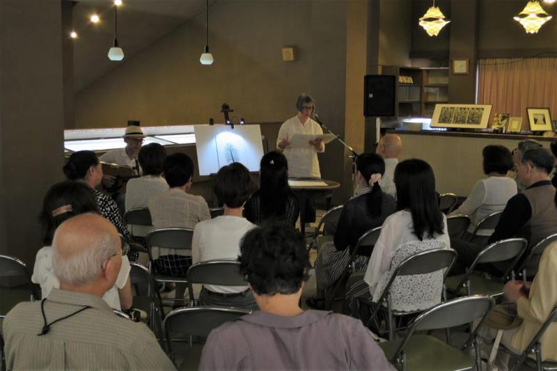 6月23日(土)、「木村茂さんの銅版画と吉野弘さんの詩を楽しむ会」を開催しました。 酒田出身の詩人・吉野弘さんと銅版画家・木村茂さんは、お互いの作品をコラボした詩画集「北象」を発表するなど、吉野さんが木村さんの作品に詩を合わせる試みがなされてきました。 当館では、詩画集「北象」をはじめ、多くの木村茂さんの作品を収蔵しており、版画を前にして詩を鑑賞することができます。 詩の朗読は、吉野弘さんの詩の朗読をライフワークとする阿蘇孝子さんで、ギタリストの佐々木さんの演奏を交えながら心に沁みる朗読をして下さいました。 また機会がありましたら、阿蘇孝子さんの朗読で美術作品と詩のコラボレーションをお届けしたいと考えています。お楽しみに(^^)/