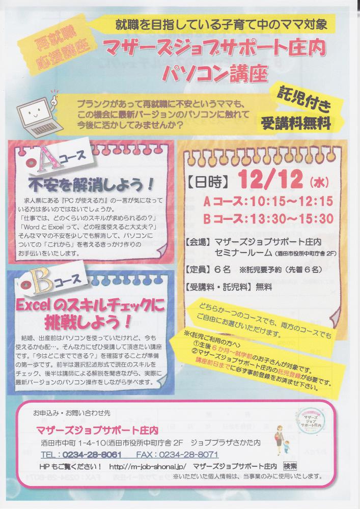 ☆マザーズジョブサポート庄内主催☆再就職応援 『パソコン講座』のお知らせ ◇Aコース◇ 12月12日(水)10:15〜12:15 『不安を解消しよう!』 「求人票の"パソコンが使える方"ってどの程度?」 「仕事では、どのくらいのパソコンのスキルが求められるの?」 「WordとExcelって、どの程度使えると大丈夫?」など いろいろな不安がありますよね… パソコンについての"これから"を考えるきっかけに♪ ◇Bコース◇ 12月12日(水)13:30〜15:30 『Excelのスキルチェックに挑戦しよう!』 「以前はパソコンを使っていたけど、今も使えるのか心配…」 現在、どこまでできるのかを 確認することが準備の第一歩です。 前半はExcelのスキルチェック、 後半は講師による解説を聞きながらの操作になります。 ♪片方のコースのみ、両方のコース、どちらの受講でも可能です♪ ※本セミナーは「雇用保険受給中の求職活動実績」として認められます。 【対 象】就職を目指している子育て中のママ ※就職活動前で何かを始めたい方でもOK【会 場】マザーズジョブサポート庄内 セミナールーム【料 金】受講料 及び 託児料 無料【定 員】先着6名 ※お申込みが必要です。【託 児】定員6名 ※事前登録・予約が必要です。 ※併設の保育ルームで、保育スタッフがお子さんを お預かりします。ママは安心して受講いただけます。 【駐車場について】お車でお越しの際は、中町庁舎脇にある〈セントラルホテル契約駐車場〉をご利用ください。(ジョブプラザさかたと表示してあります。)※契約駐車場が満車の場合は、酒田市中央地下駐車場をご利用ください。地下駐車場をご利用の方は、無料駐車券(最大2時間)を発行いたします。お帰りの際に、コンシェルジュ窓口へお声がけください。 お気軽にお問い合わせください♪ ◇お申込み・お問い合わせ◇マザーズジョブサポート庄内TEL:0234-28-8061