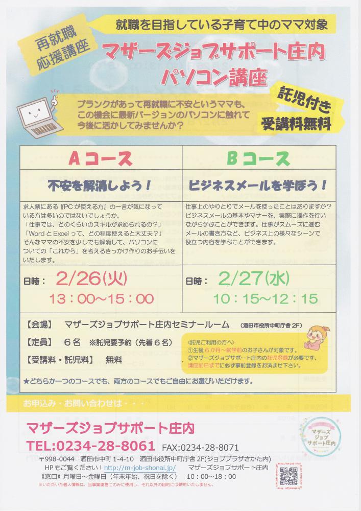 ☆マザーズジョブサポート庄内主催☆ 再就職応援 『パソコン講座』のお知らせ ◇Aコース◇ 2月26日(金)13:00〜15:00 『不安を解消しよう!』 「求人票の"パソコンが使える方"ってどの程度?」 「仕事では、どのくらいのパソコンのスキルが求められるの?」 「WordとExcelって、どの程度使えると大丈夫?」など いろいろな不安がありますよね… パソコンについての"これから"を考えるきっかけに♪ ◇Bコース◇ 2月27日(水)10:15〜12:15 『ビジネスメールを学ぼう!』 仕事上のやりとりでメールを使ったことはありますか? ビジネスメールの基本やマナーを、実際に操作を行い ながら学ぶことができます。仕事がスムーズに進む メールの書き方など、ビジネス上の様々なシーンで 役立つメールの書き方を学んでみませんか? ♪片方のコースのみ、両方のコースの受講どちらでもOKです♪ ※本セミナーは「雇用保険受給中の求職活動実績」として認められます。 【対 象】就職を目指している子育て中のママ ※就職活動前で何かを始めたい方でもOK【会 場】マザーズジョブサポート庄内 セミナールーム【料 金】受講料 及び 託児料 無料【定 員】先着6名 ※お申込みが必要です。【託 児】定員6名 ※事前登録・予約が必要です。 ※併設の保育ルームで、保育スタッフがお子さんを お預かりします。ママは安心して受講いただけます。 【駐車場について】お車でお越しの際は、中町庁舎脇にある〈セントラルホテル契約駐車場〉をご利用ください。(ジョブプラザさかたと表示してあります。)※契約駐車場が満車の場合は、酒田市中央地下駐車場をご利用ください。地下駐車場をご利用の方は、無料駐車券(最大2時間)を発行いたします。お帰りの際に、コンシェルジュ窓口へお声がけください。 お気軽にお問い合わせください♪ ◇お申込み・お問い合わせ◇マザーズジョブサポート庄内TEL:0234-28-8061