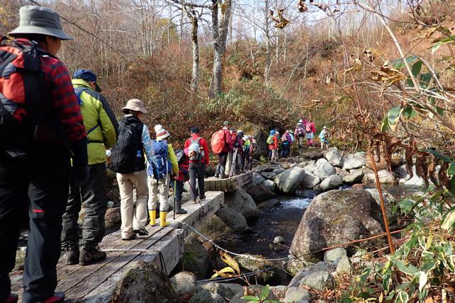 「さよならブナ林」27名参加です。洪水で流された橋の補修終わったばかり。再軸の日和になりました。