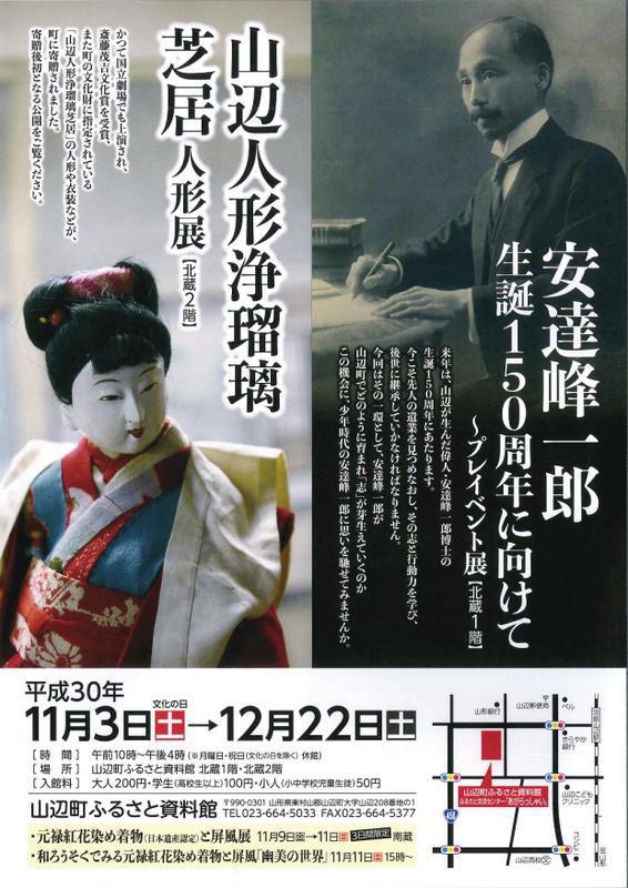 山辺町が生んだ偉人・安達峰一郎博士は、第1次世界大戦の前後に外交官として世界平和のために尽力し、「世界の良心」とうたわれています。来年は生誕150周年にあたります。そのプレイベント展として、ふるさと資料館北蔵1階にて、安達峰一郎博士の幼少時代を中心に、貴重な資料や写真等を展示しています。また、北蔵2階では、町の文化財に指定されている「山辺人形浄瑠璃芝居」の人形や衣装の数々を展示しています。この機会にぜひご覧ください。 「安達峰一郎生誕150周年に向けて」「山辺人形浄瑠璃芝居人形展」 日  時・・ 平成30年11月3日(土)〜12月22日(土)          ※月曜・祝日休館 時  間・・ 午前10時〜午後4時 場  所・・ ふるさと資料館北蔵1階・北蔵2階 入館料 ・・ 大人200円・学生(高校生以上)100円・小人(小中学校児童生徒)50円 お問い合わせ先・・山辺町ふるさと資料館 [TEL」023−664−5033