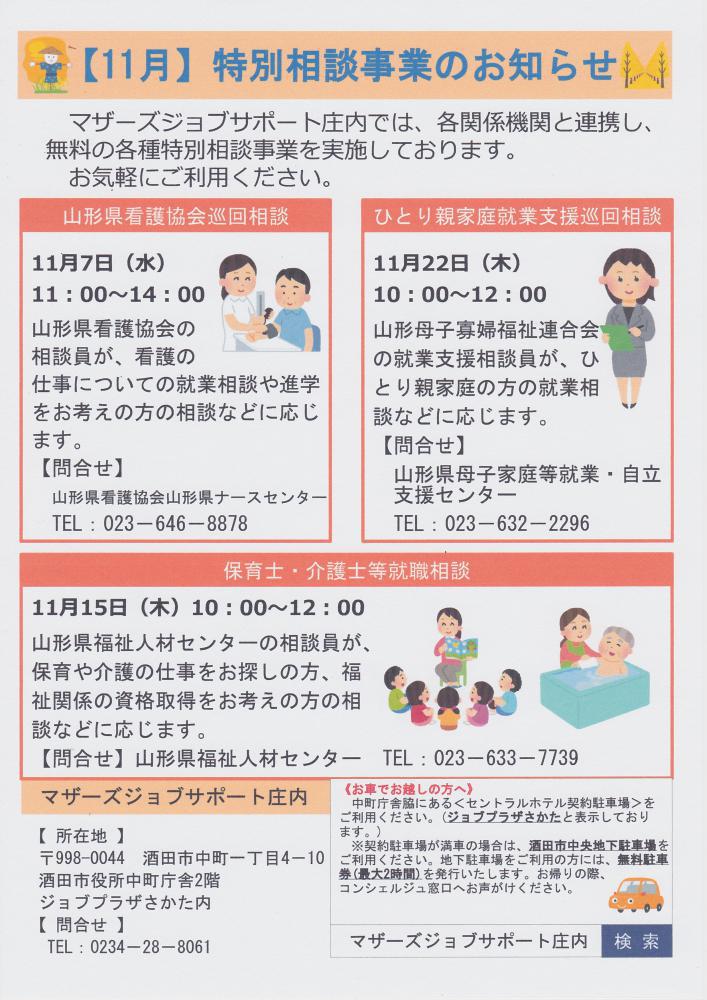 マザーズジョブサポート庄内では、各関係機関と連携し、各種特別相談事業を実施しております。ぜひ、ご利用ください。  山形県看護協会巡回相談 ※お申し込み不要  日時  11月7日(水)11:00〜14:00  場所  マザーズジョブサポート庄内 セミナールーム  問合せ 山形県看護協会 пF023-646-8878       HP:http://www.nurse-yamagata.or.jp/       看護の仕事への復職をお考えの方、お気軽にご相談ください   保育士・介護士等就職相談 ※お申し込み不要  日時  11月15日(木)10:00〜12:00  場所  マザーズジョブサポート庄内 セミナールーム   問合せ 山形県福祉人材センター пF023-633-7739       HP:http://www.ymgt-shakyo.or.jp/jinzai/                 保育士・介護士・看護師など資格をお持ちの方や、          資格取得を目指している方、福祉職にご関心のある方は          お気軽にお越しください。  ひとり親家庭就業支援相談 [要予約]  日時  11月22日(木)10:00〜12:00  場所  マザーズジョブサポート庄内 セミナールーム  問合せ 山形県母子家庭等就業・自立支援センター пF023-632-2296       HP:http://www.y-boshi.com/self-support/                  ひとり親家庭の方や今後について考えている方、       どうぞお気軽にお越しください。      ※ご利用希望の方は、マザーズジョブサポート庄内への       ご登録が必要となります。      ※ご相談の際、お子さまの託児は『保育ルームきらきら』を       ご利用いただけます。 事前にご予約が必要です。  ※各相談会について、利用ご希望の方は、 マザーズジョブサポート庄内 マザーズ・コンシェルジュまで お気軽にお声掛けください。※ご相談の際、お子さまの託児は『保育ルーム きらきら』をご利用いただけます。 託児ルームのご利用には、事前のご登録が必要です。  【駐車場について】 お車でお越しの際は、中町庁舎脇にある 〈セントラルホテル契約駐車場〉をご利用ください。 (ジョブプラザさかたと表示してあります。) ※契約駐車場が満車の場合は、 酒田市中央地下駐車場をご利用ください。 地下駐車場をご利用の方は、無料駐車券(最大2時間)を 発行いたします。 お帰りの際に、コンシェルジュ窓口へお声がけください。 ◇お申込み・お問い合わせ◇マザーズジョブサポート庄内TEL:0234-28-8061