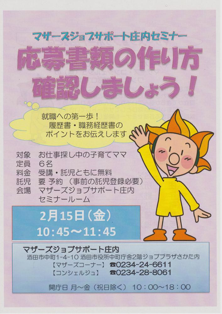 2月『マザーズジョブサポート庄内 求職支援セミナー』『応募書類の作り方確認しましょう!』を行います! このセミナーは就職への第一歩!履歴書・職務経歴書のポイントをお伝えします。 ハローワークマザーズコーナーでは定期的にセミナーを開催します。奮ってご参加下さい。受講後も疑問点など、窓口にてご相談が受けられます。☆雇用保険受給者の方は求職活動実績にカウント出来ます☆ 【日 時】2月15日(金) 10時45分〜11時45分【対 象】お仕事探し中の子育てママさん【会 場】マザーズジョブサポート庄内 セミナールーム【料 金】受講料 及び 託児料 無料【定 員】先着6名 ※お申込みが必要です。【託 児】定員6名 ※事前登録・予約が必要です。 ※併設の保育ルームで、保育スタッフがお子さんを お預かりします。ママは安心して受講いただけます。 【駐車場について】 お車でお越しの際は、中町庁舎脇にある 〈セントラルホテル契約駐車場〉をご利用ください。 (ジョブプラザさかたと表示してあります。) ※契約駐車場が満車の場合は、 酒田市中央地下駐車場をご利用ください。 地下駐車場をご利用の方は、無料駐車券を発行いたします。 お帰りの際に、マザーズ窓口へお声がけください。 どうぞ、お気軽にお問い合わせくださいね。 ◇お申込み・お問い合わせ◇マザーズジョブサポート庄内TEL:0234-24-6611(マザーズコーナー)TEL:0234-28-8061(コンシェルジュコーナー)開庁日 月〜金(祝日除く)10:00〜18:00