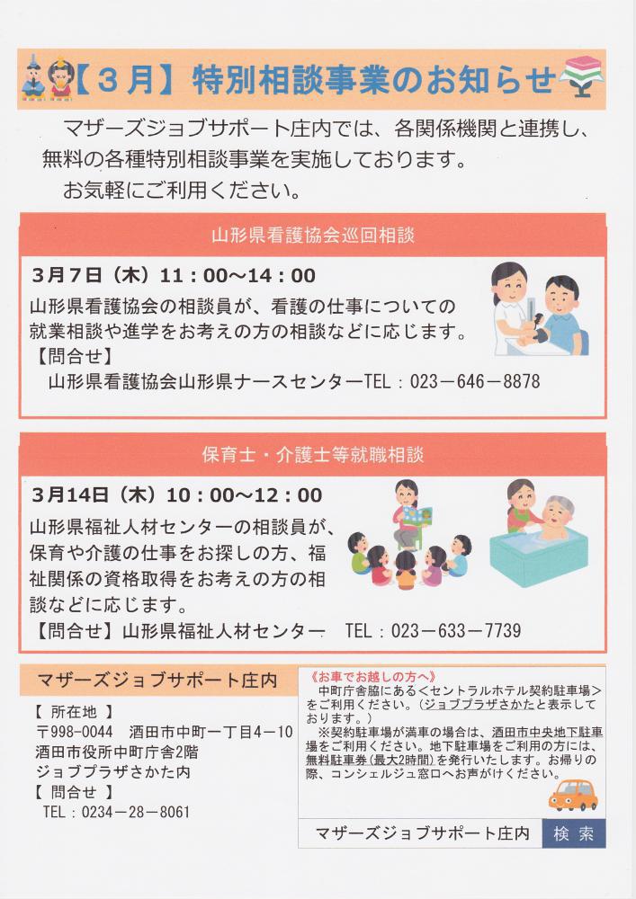 マザーズジョブサポート庄内では、各関係機関と連携し、各種特別相談事業を実施しております。ぜひ、ご利用ください。 山形県看護協会巡回相談 ※お申し込み不要 日時 3月7日(木)11:00〜14:00 場所 マザーズジョブサポート庄内 セミナールーム 問合せ 山形県看護協会 пF023-646-8878 HP:http://www.nurse-yamagata.or.jp/ 看護の仕事への復職をお考えの方、お気軽にご相談ください 保育士・介護士等就職相談 ※お申し込み不要 日時 3月14日(木)10:00〜12:00 場所 マザーズジョブサポート庄内 セミナールーム 問合せ 山形県福祉人材センター пF023-633-7739 HP:http://www.ymgt-shakyo.or.jp/jinzai/ 保育士・介護士・看護師など資格をお持ちの方や、 資格取得を目指している方、福祉職にご関心のある方は お気軽にお越しください。 ※ご利用希望の方は、マザーズジョブサポート庄内への ご登録が必要となります。 ※ご相談の際、お子さまの託児は『保育ルームきらきら』を ご利用いただけます。 事前にご予約が必要です。 ※各相談会について、利用ご希望の方は、 マザーズジョブサポート庄内 マザーズ・コンシェルジュまで お気軽にお声掛けください。※ご相談の際、お子さまの託児は『保育ルーム きらきら』をご利用いただけます。 託児ルームのご利用には、事前のご登録が必要です。 【駐車場について】 お車でお越しの際は、中町庁舎脇にある 〈セントラルホテル契約駐車場〉をご利用ください。 (ジョブプラザさかたと表示してあります。) ※契約駐車場が満車の場合は、 酒田市中央地下駐車場をご利用ください。 地下駐車場をご利用の方は、無料駐車券(最大2時間)を 発行いたします。 お帰りの際に、コンシェルジュ窓口へお声がけください。 ◇お申込み・お問い合わせ◇マザーズジョブサポート庄内TEL:0234-28-8061