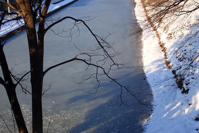 節電なのかお堀の水動かず氷詰め。水鳥は一羽も無し。