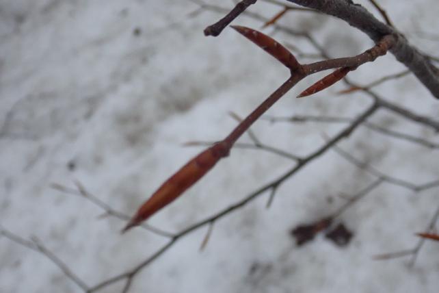 ブナの冬芽を芽鱗(鱗で覆われているよな)と言います。今年は花芽も無く葉芽たけなので固く細長い。