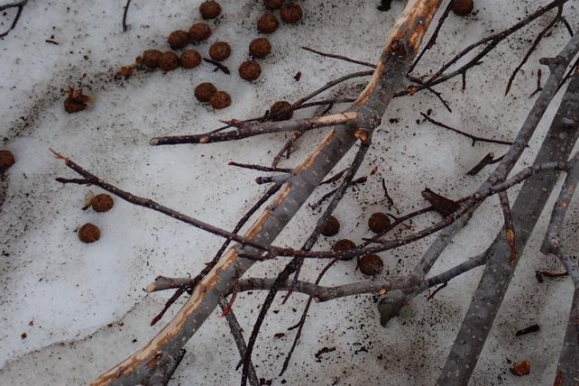 かじった跡から推測して動物を当てる。その場所観察すると事後処理の糞を捜す。推測しみます。丸い物が沢山落ちています。木下の丸い物から判断できそうです。