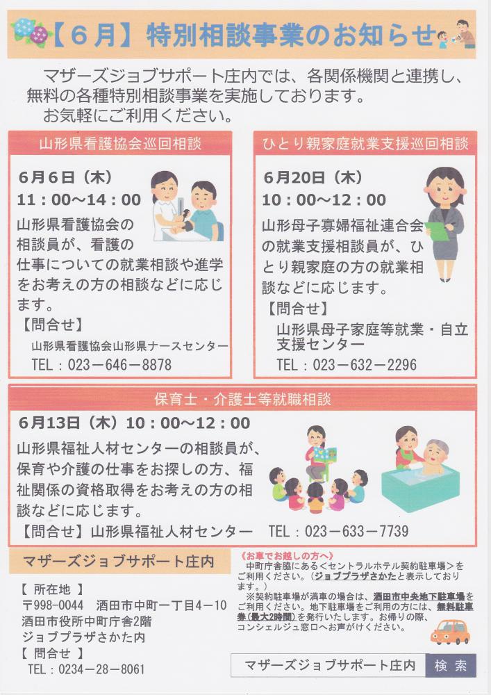 マザーズジョブサポート庄内では、各関係機関と連携し、各種特別相談事業を実施しております。ぜひ、ご利用ください。 山形県看護協会巡回相談 ※お申し込み不要 日時 6月6日(木)11:00〜14:00 場所 マザーズジョブサポート庄内 セミナールーム 問合せ 山形県看護協会 пF023-646-8878 HP:http://www.nurse-yamagata.or.jp/ 看護の仕事への復職をお考えの方、お気軽にご相談ください。 保育士・介護士等就職相談 ※お申し込み不要 日時 6月13日(木)10:00〜12:00 場所 マザーズジョブサポート庄内 セミナールーム 問合せ 山形県福祉人材センター пF023-633-7739 HP:http://www.ymgt-shakyo.or.jp/jinzai/ 保育士・介護士・看護師など資格をお持ちの方や、 資格取得を目指している方、福祉職にご関心のある方は お気軽にお越しください。 ひとり親家庭就業支援相談 [要予約] 日時 6月20日(木)10:00〜12:00 場所 マザーズジョブサポート庄内 セミナールーム 問合せ 山形県母子家庭等就業・自立支援センター пF023-632-2296 HP:http://www.y-boshi.com/self-support/ ひとり親家庭の方や今後について考えている方、 どうぞお気軽にお越しください。 ※ご利用希望の方は、マザーズジョブサポート庄内への ご登録が必要となります。 ※ご相談の際、お子さまの託児は『保育ルームきらきら』を ご利用いただけます。 事前にご予約が必要です。 ※各相談会について、利用ご希望の方は、 マザーズジョブサポート庄内 マザーズ・コンシェルジュまで お気軽にお声掛けください。※ご相談の際、お子さまの託児は『保育ルーム きらきら』をご利用いただけます。 託児ルームのご利用には、事前のご登録が必要です。 【駐車場について】 お車でお越しの際は、中町庁舎脇にある 〈セントラルホテル契約駐車場〉をご利用ください。 (ジョブプラザさかたと表示してあります。) ※契約駐車場が満車の場合は、 酒田市中央地下駐車場をご利用ください。 地下駐車場をご利用の方は、無料駐車券(最大2時間)を 発行いたします。 お帰りの際に、コンシェルジュ窓口へお声がけください。 ◇お申込み・お問い合わせ◇マザーズジョブサポート庄内TEL:0234-28-8061