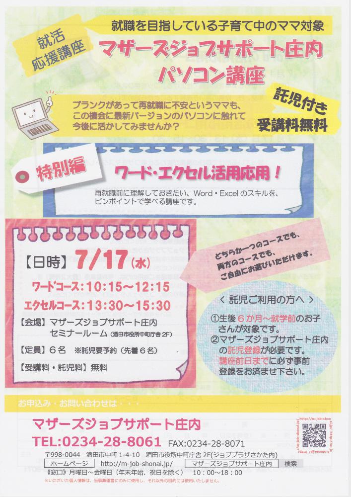 ☆マザーズジョブサポート庄内主催☆就活応援 『パソコン講座〜特別編〜 ワード・エクセル活用応用!』のお知らせ ◇再就職前に理解しておきたい、Word・Excelのスキルを、 ピンポイントで学べる講座です。 7月17日(水)10:15〜12:15 『ワード活用応用コース』 「伝わる文章を短時間で仕上げる」コツを学びます。 単語・行・段落の違いを理解することから始めましょう。 7月17日(水)13:30〜15:30 『エクセル活用応用コース』 「見やすい表を手早く作る」コツを学びます。 知っているだけで毎日の業務が変わる仕事ワザを マスターしましょう。 ♪片方のコースのみ、両方のコース、どちらの受講でも可能です♪ ※本セミナーは「雇用保険受給中の求職活動実績」として認められます。 【対 象】就職を目指している子育て中のママ ※就職活動前で何かを始めたい方でもOK【会 場】マザーズジョブサポート庄内 セミナールーム【料 金】受講料 及び 託児料 無料【定 員】先着6名 ※お申込みが必要です。【託 児】定員6名 ※事前登録・予約が必要です。 ※併設の保育ルームで、保育スタッフがお子さんを お預かりします。ママは安心して受講いただけます。 【駐車場について】お車でお越しの際は、中町庁舎脇にある〈セントラルホテル契約駐車場〉をご利用ください。(ジョブプラザさかたと表示してあります。)※契約駐車場が満車の場合は、酒田市中央地下駐車場をご利用ください。地下駐車場をご利用の方は、無料駐車券(最大2時間)を発行いたします。お帰りの際に、コンシェルジュ窓口へお声がけください。 お気軽にお問い合わせください♪ ◇お申込み・お問い合わせ◇マザーズジョブサポート庄内TEL:0234-28-8061