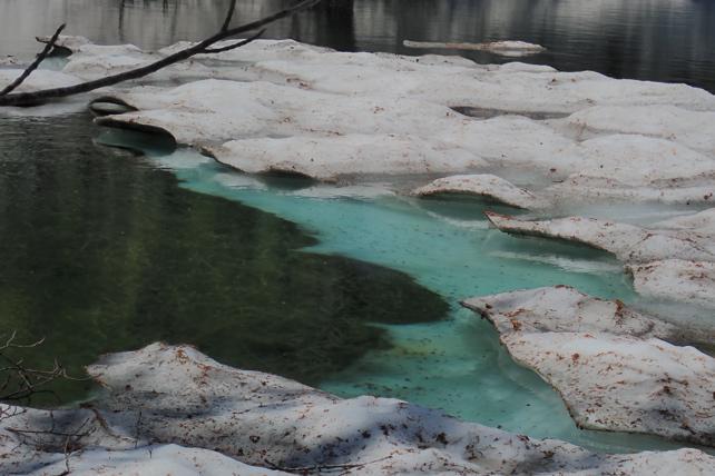 沼に沈んでいる雪の固まるが光のいたずらで、みごとです。