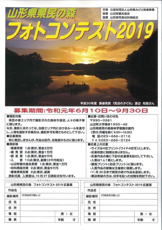 県民の森では、「フォトコンテスト2019」の作品を募集しています。撮影対象は、県民の森エリア内で撮影した森林や湖沼、人々の様子等です。四季折々の美しい県民の森の風景をカメラに収めてみませんか!なお、最優秀賞に選ばれた作品には、賞状と賞金3万円が贈られます。その他多数の賞を準備しております。多数の応募をお待ちしております。 山形県県民の森フォトコンテスト□応募期間 令和元年6月10日〜9月30日□撮影対象 県民の森エリア内の様子□応募資格 特に限定しませんが、作品は自作、未発表のものに限ります。□応募・お問合せ先 〒990-0361 山辺町大字畑谷1933-42 山形県県民の森森林学習展示館内 (受付:月曜を除く9:00〜16:30) 電話:023-666-2116 FAX:023-666-2124