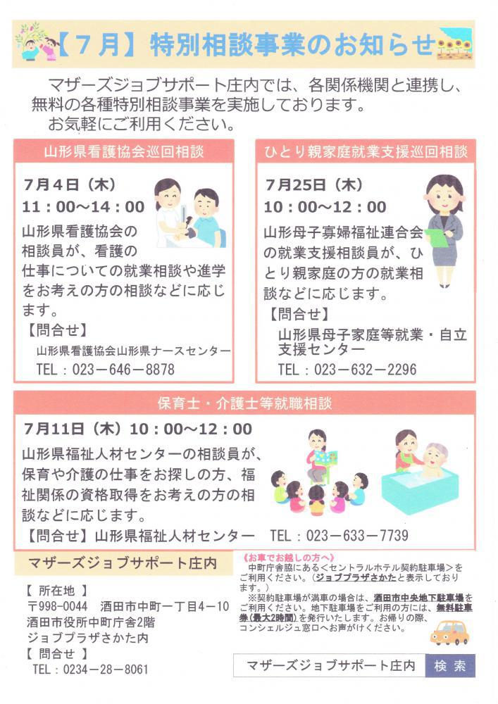 マザーズジョブサポート庄内では、各関係機関と連携し、各種特別相談事業を実施しております。ぜひ、ご利用ください。 山形県看護協会巡回相談 ※お申し込み不要 日時 7月4日(木)11:00〜14:00 場所 マザーズジョブサポート庄内 セミナールーム 問合せ 山形県看護協会 пF023-646-8878 HP:http://www.nurse-yamagata.or.jp/ 看護の仕事への復職をお考えの方、お気軽にご相談ください。 保育士・介護士等就職相談 ※お申し込み不要 日時 7月11日(木)10:00〜12:00 場所 マザーズジョブサポート庄内 セミナールーム 問合せ 山形県福祉人材センター пF023-633-7739 HP:http://www.ymgt-shakyo.or.jp/jinzai/ 保育士・介護士・看護師など資格をお持ちの方や、 資格取得を目指している方、福祉職にご関心のある方は お気軽にお越しください。 ひとり親家庭就業支援相談 [要予約] 日時 7月25日(木)10:00〜12:00 場所 マザーズジョブサポート庄内 セミナールーム 問合せ 山形県母子家庭等就業・自立支援センター пF023-632-2296 HP:http://www.y-boshi.com/self-support/ ひとり親家庭の方や今後について考えている方、 どうぞお気軽にお越しください。 ※ご利用希望の方は、マザーズジョブサポート庄内への ご登録が必要となります。 ※ご相談の際、お子さまの託児は『保育ルームきらきら』を ご利用いただけます。 事前にご予約が必要です。 ※各相談会について、利用ご希望の方は、 マザーズジョブサポート庄内 マザーズ・コンシェルジュまで お気軽にお声掛けください。※ご相談の際、お子さまの託児は『保育ルーム きらきら』をご利用いただけます。 託児ルームのご利用には、事前のご登録が必要です。 【駐車場について】 お車でお越しの際は、中町庁舎脇にある 〈セントラルホテル契約駐車場〉をご利用ください。 (ジョブプラザさかたと表示してあります。) ※契約駐車場が満車の場合は、 酒田市中央地下駐車場をご利用ください。 酒田市中央地下駐車場をご利用の方は、無料駐車券(最大2時間)を 発行いたします。 お帰りの際に、コンシェルジュ窓口へお声がけください。 ◇お申込み・お問い合わせ◇マザーズジョブサポート庄内TEL:0234-28-8061