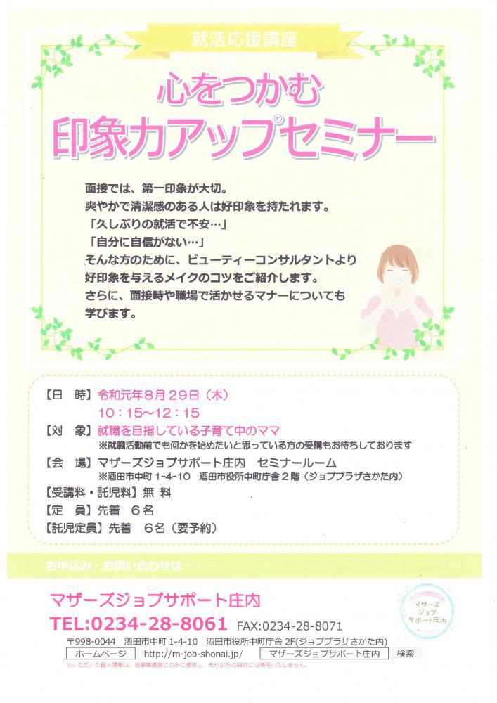 【新企画!】☆心をつかむ 印象力アップセミナー☆面接では、第一印象が大切。爽やかで清潔感のある人は好印象を持たれます。「久しぶりの就活で不安…」「自分に自信がない…」そんな方のために、ビューティーコンサルタントより好印象を与えるメイクのコツをご紹介します。さらに、面接時や職場で活かせるマナーについても学びます。 【日 時】令和元年8月29日(木) 【対 象】就職を目指している子育て中のママ※就職活動前で何かを始めたい方でもOK【会 場】マザーズジョブサポート庄内 セミナールーム【料 金】受講料 及び 託児料 無料【定 員】先着6名 ※お申込みが必要です。 【託 児】定員6名 ※事前登録・予約が必要です。※併設の保育ルームで、保育スタッフがお子さんをお預かりします。ママは安心して受講いただけます。 ※本セミナーは「雇用保険受給中の求職活動実績」として認められます。 【駐車場について】お車でお越しの際は、中町庁舎脇にある〈セントラルホテル契約駐車場〉をご利用ください。(ジョブプラザさかたと表示してあります。)※契約駐車場が満車の場合は、酒田市中央地下駐車場をご利用ください。酒田市中央地下駐車場をご利用の方は、無料駐車券(最大2時間)を発行いたします。お帰りの際に、コンシェルジュ窓口へお声がけください。 どうぞ、お気軽にお問い合わせくださいね。 ◇お申込み・お問い合わせ◇マザーズジョブサポート庄内TEL:0234-28-8061