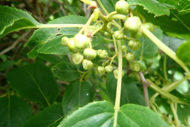 葉腋の根元に隠れる様に花序茎を伸ばす。