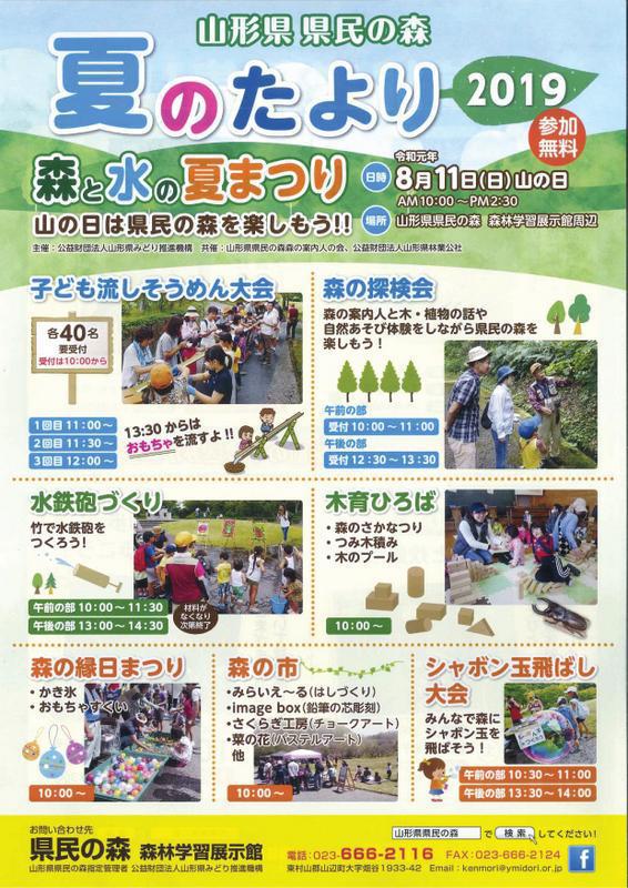 県民の森より夏のたよりが届きました(^o^)8月11日(日)の山の日は『森と水の夏まつり』を開催します。自然の中で、家族みんなで楽しめるイベントが盛りだくさん!!山の日は県民の森に出かけよう!! 『森と水の夏まつり』□日 時  令和元年8月11日(日・山の日)□時 間  AM10:00〜PM2:30□場 所  県民の森森林学習展示館周辺□イベント内容  子ども流しそうめん大会  森の探検会  水鉄砲づくり  木育ひろば  森の縁日まつり 森の市 シャボン玉飛ばし大会 ※当日受付が必要なイベントもあります。詳しくは県民の森にお問合せ下さい。□お問合せ先  県民の森森林学習展示館  電話:023−666−2116  FAX:023−666−2124 また、県民の森では様々な行事を開催しています。自然を満喫できる県民の森に出かけてみませんか♪