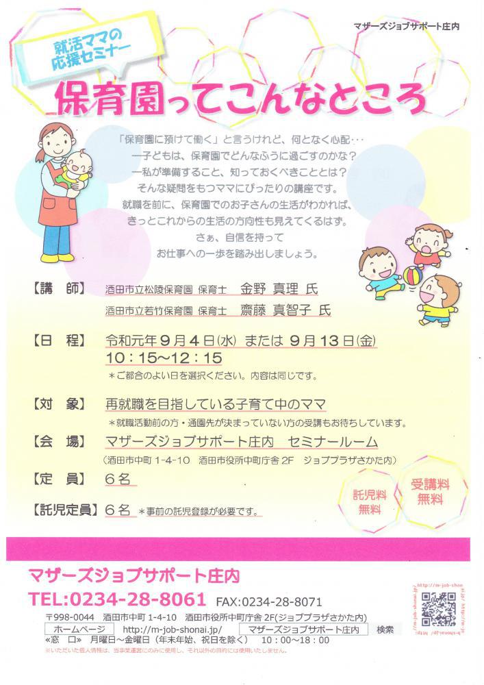 暑い日が続きますね!水分補給や体調管理に気をつけていきましょう。コンシェルジュセミナー『保育園ってこんなところ』のお知らせです。 ママがお仕事を始めるにあたってお子さんを保育園へ預ける方は多いかと思います。中には、初めての子育て、初めての保育園…!と不安や緊張感をお持ちの方もいるのでは? このセミナーを受講して「保育園に子どもを預ける」とはどういうことなのかを学んでみませんか? 松陵保育園と若竹保育園の保育士さんを講師にお招きして「保育園の一日」「保育士とのかかわり」などをお話していただきます。保育園の様子をスライドでもお見せします。(セミナー後半には、質問タイムも設けています。) 就職活動前の方も、通園先が決まっていない方の受講もお待ちしております。 【日 時】9月4日(水) または 13日(金)10時15分〜12時15分※内容は同一です。いずれかの日にちをお選びください。【対 象】就職を目指している子育て中のママ※就職活動前で何かを始めたい方でもOK【会 場】マザーズジョブサポート庄内 セミナールーム【料 金】受講料 及び 託児料 無料【定 員】先着6名 ※お申込みが必要です。【託 児】定員6名 ※事前登録・予約が必要です。※併設の保育ルームで、保育スタッフがお子さんをお預かりします。ママは安心して受講いただけます。 【駐車場について】お車でお越しの際は、中町庁舎脇にある〈セントラルホテル契約駐車場〉をご利用ください。(ジョブプラザさかたと表示してあります。)※契約駐車場が満車の場合は、酒田市中央地下駐車場をご利用ください。酒田市中央地下駐車場をご利用の方は、無料駐車券(最大2時間)を発行いたします。お帰りの際に、コンシェルジュ窓口へお声がけください。 どうぞ、お気軽にお問い合わせくださいね。 お問合せはマザーズジョブサポート庄内TEL:0234-28-8061FAX:0234-28-8071
