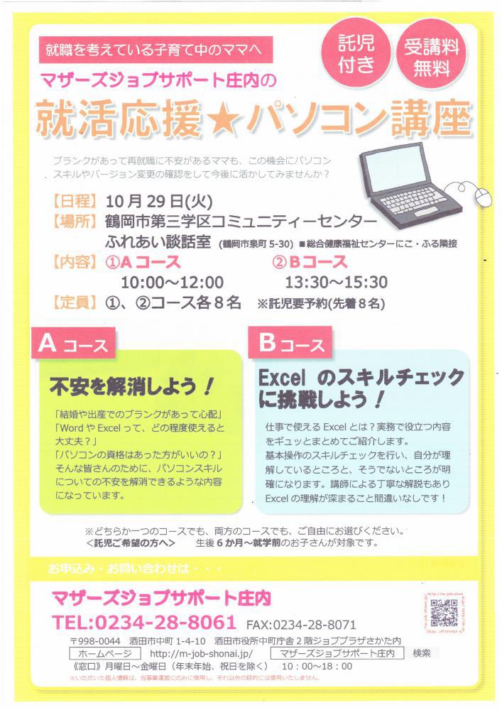 ☆マザーズジョブサポート庄内主催☆再就職応援 <鶴岡開催>『パソコン講座』のお知らせ ◇Aコース◇ 10月29日(火)10:00〜12:00『不安を解消しよう!』「結婚や出産・子育てなどを理由に、一度仕事をやめてしまったけれど…。ブランクが心配。」「WordとExcelって、どの程度使えると大丈夫?」「パソコンの資格はあったほうがいいの?」そんな皆さんのために、この講座ではパソコンスキルについての不安を解消できるようご案内します。 ◇Bコース◇ 10月29日(火)13:30〜15:30『Excelのスキルチェックに挑戦しよう!』仕事で使えるExcleとは?実務で役立つ内容をギュッとまとめてご紹介します。基本操作のスキルチェックを行い、自分が理解しているところとそうでないところ明確にすることができます。講師による丁寧な解説もありExcelの理解が深まること間違いなしです! ♪片方のコースのみ、両方のコース、どちらの受講でも可能です♪ ※本セミナーは「雇用保険受給中の求職活動実績」として認められます。 【対 象】就職を目指している子育て中のママ※就職活動前で何かを始めたい方でもOK【会 場】鶴岡市第三学区コミュニティセンター「ふれあい談話室」(総合保健福祉センターにこ♥ふる隣接)鶴岡市泉町5-30 0235-24-2212【料 金】受講料 及び 託児料 無料【定 員】先着8名 ※お申込みが必要です。【託 児】定員8名 ※予約が必要です。※会場隣の第一和室にて、保育スタッフがお子さんをお預かりします。ママは安心して受講いただけます。 【駐車場について】お車でお越しの際は、にこ♥ふるの駐車場をご利用ください。 前回7月に開催した際も、大好評でした!お早目のご応募をお待ちしております。お気軽にお問い合わせください♪(Aコース・Bコース共に初心者向けの内容となっております。) ◇お申込み・お問い合わせ◇マザーズジョブサポート庄内TEL:0234-28-8061