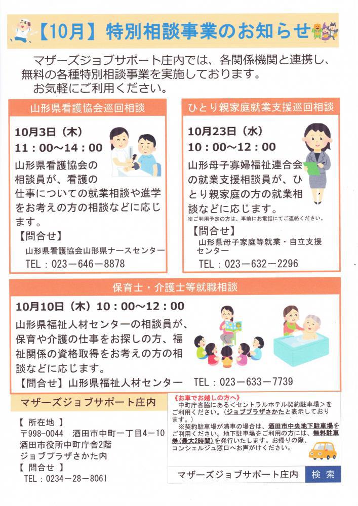 マザーズジョブサポート庄内では、各関係機関と連携し、各種特別相談事業を実施しております。ぜひ、ご利用ください。 山形県看護協会巡回相談 ※お申し込み不要日 時 10月3日(木)11:00〜14:00場 所 マザーズジョブサポート庄内 セミナールーム問合せ 山形県看護協会 пF023-646-8878HP:http://www.nurse-yamagata.or.jp/ 看護の仕事への復職をお考えの方、お気軽にご相談ください。 保育士・介護士等就職相談 ※お申し込み不要日 時 10月10(木)10:00〜12:00場 所 マザーズジョブサポート庄内 セミナールーム 問合せ 山形県福祉人材センター пF023-633-7739HP:http://www.ymgt-shakyo.or.jp/jinzai/ 保育士・介護士・看護師など資格をお持ちの方や、資格取得を目指している方、福祉職にご関心のある方はお気軽にお越しください。 ひとり親家庭就業支援相談 [要予約]日 時 10月23日(水)10:00〜12:00場 所 マザーズジョブサポート庄内 セミナールーム問合せ 山形県母子家庭等就業・自立支援センター пF023-632-2296HP:http://www.y-boshi.com/self-support/ ひとり親家庭の方や今後について考えている方、どうぞお気軽にお越しください。 ※ご利用希望の方は、マザーズジョブサポート庄内へのご登録が必要となります。※ご相談の際、お子さまの託児は『保育ルームきらきら』をご利用いただけます。事前にご予約が必要です。 ※各相談会について、利用ご希望の方は、マザーズジョブサポート庄内 マザーズ・コンシェルジュまでお気軽にお声掛けください。※ご相談の際、お子さまの託児は『保育ルーム きらきら』をご利用いただけます。託児ルームのご利用には、事前のご登録が必要です。 【駐車場について】お車でお越しの際は、中町庁舎脇にある〈セントラルホテル契約駐車場〉をご利用ください。(ジョブプラザさかたと表示してあります。)※契約駐車場が満車の場合は、酒田市中央地下駐車場をご利用ください。酒田市中央地下駐車場をご利用の方は、無料駐車券(最大2時間)を発行いたします。お帰りの際に、コンシェルジュ窓口へお声がけください。 ◇お申込み・お問い合わせ◇マザーズジョブサポート庄内TEL:0234-28-8061