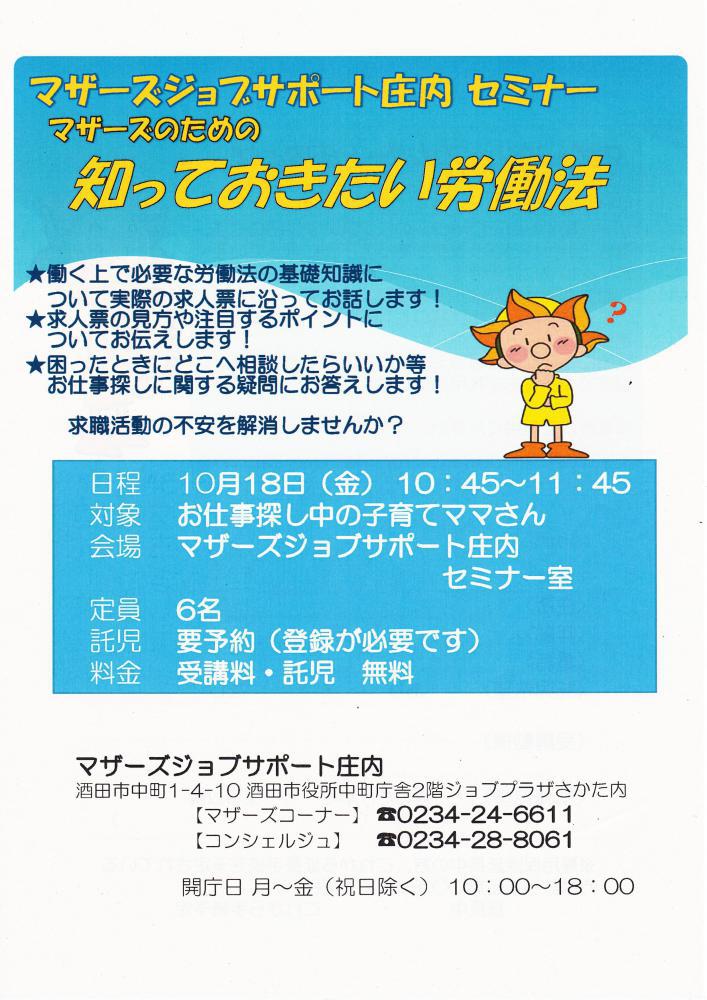 10月『マザーズジョブサポート庄内 求職支援セミナー』『知っておきたい労働法』を行います! 働く上で必要な労働法の基礎知識について実際の求人票をもとに説明いたします。 ★どんなふうに仕事を選べばいいの?★仕事探しは何から始めたらいいの?★何を準備しなきゃいけないの? など求職活動の不安を解消しませんか? ハローワークマザーズコーナーでは定期的にセミナーを開催します。奮ってご参加下さい。受講後も疑問点など、窓口にてご相談が受けられます。☆雇用保険受給者の方は求職活動実績にカウント出来ます☆ 【日 時】10月18日(金)10時45分〜11時45分【対 象】お仕事探し中の子育てママさん【会 場】マザーズジョブサポート庄内 セミナールーム【料 金】受講料 及び 託児料 無料【定 員】先着6名 ※お申込みが必要です。【託 児】定員6名 ※事前登録・予約が必要です。※併設の保育ルームで、保育スタッフがお子さんをお預かりします。ママは安心して受講いただけます。                 【駐車場について】お車でお越しの際は、中町庁舎脇にある〈セントラルホテル契約駐車場〉をご利用ください。(ジョブプラザさかたと表示してあります。)※契約駐車場が満車の場合は、酒田市中央地下駐車場をご利用ください。酒田市中央地下駐車場をご利用の方は、無料駐車券を発行いたします。お帰りの際に、マザーズ窓口へお声がけください。 どうぞ、お気軽にお問い合わせくださいね。 ◇お申込み・お問い合わせ◇マザーズジョブサポート庄内TEL:0234-24-6611(マザーズコーナー)TEL:0234-28-8061(コンシェルジュコーナー)開庁日 月〜金(祝日除く)10:00〜18:00