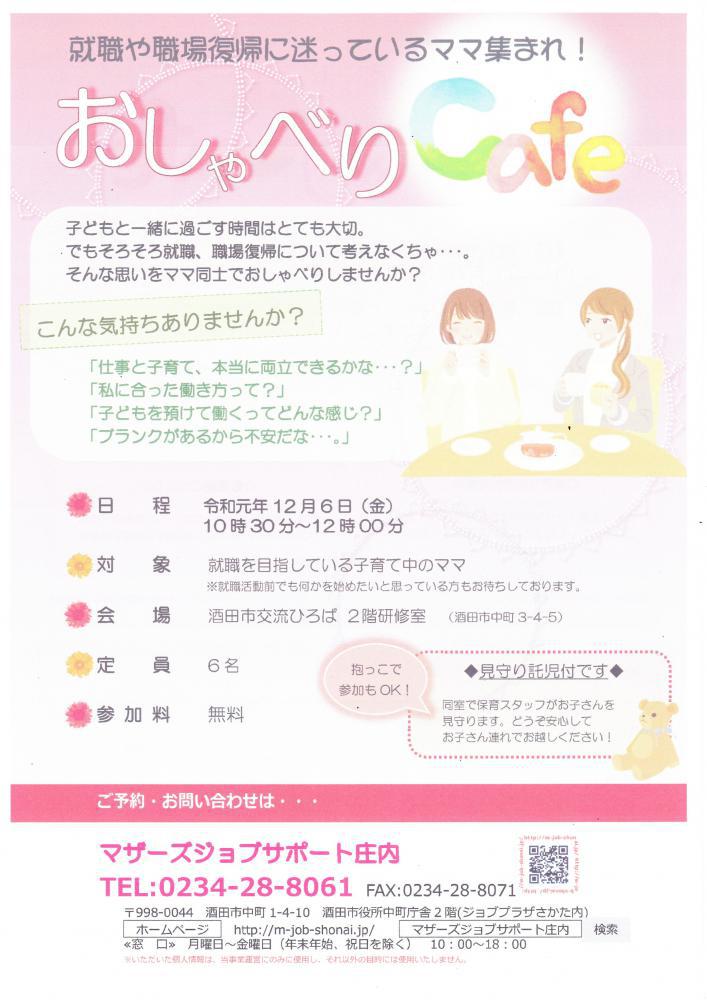 ☆マザーズジョブサポート庄内主催☆『おしゃべりCafe』のお知らせです。 子どもと過ごす時間はとても大切。でもそろそろ就職、職場復帰について考えなくちゃ・・・。「ブランクがあるから不安だな・・・。」「私にあった働き方って?」「子どもを預けて働くってどんな感じ?」こんな同じ思いを持っているママたちとおしゃべりしながら働くイメージづくりをしてみませんか? 【日 時】12月6日(金)10時30分〜12時00分【対 象】就職を目指している子育て中のママ※就職活動前で何かを始めたい方でもOK【会 場】酒田市交流ひろば 2階研修室(酒田市中町3-4-5)【料 金】参加料 無料【定 員】先着6名 ※お申込みが必要です。【託 児】見守り託児付きです。※同室で保育スタッフがお子さんを見守ります。安心してお子さん連れでお越しください。※抱っこでの参加もOKです! 【駐車場について】お車でお越しの際は、交流ひろば隣接の「中町サンパーキング」が無料で利用できます。 どうぞ、お気軽にお問い合わせくださいね。 お問合せはマザーズジョブサポート庄内TEL:0234-28-8061FAX:0234-28-8071