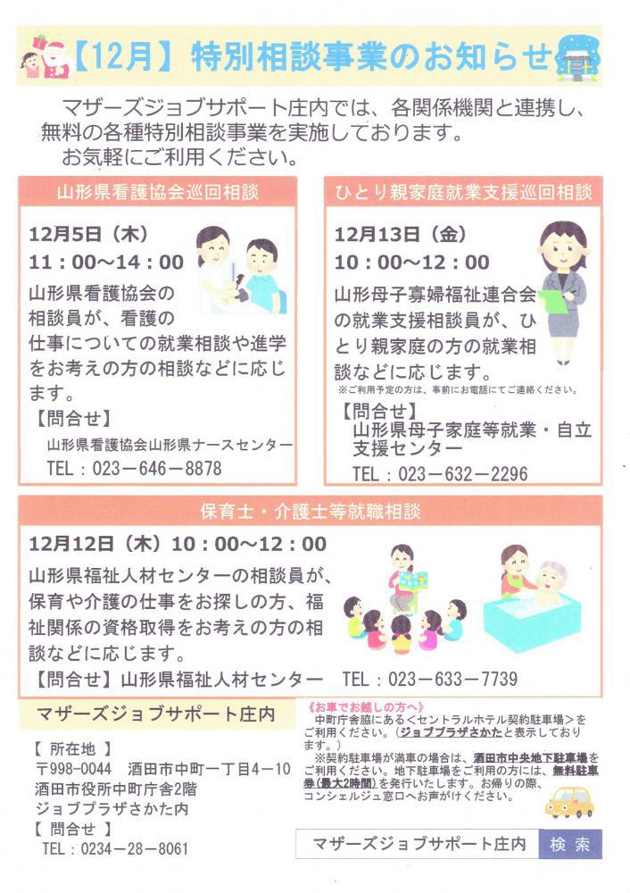 マザーズジョブサポート庄内では、各関係機関と連携し、各種特別相談事業を実施しております。ぜひ、ご利用ください。  山形県看護協会巡回相談 ※お申し込み不要日 時 12月5日(木)11:00〜14:00場 所 マザーズジョブサポート庄内 セミナールーム問合せ 山形県看護協会 пF023-646-8878HP:http://www.nurse-yamagata.or.jp/ 看護の仕事への復職をお考えの方、お気軽にご相談ください。   保育士・介護士等就職相談 ※お申し込み不要日 時 12月12日(木)10:00〜12:00場 所 マザーズジョブサポート庄内 セミナールーム 問合せ 山形県福祉人材センター пF023-633-7739HP:http://www.ymgt-shakyo.or.jp/jinzai/                保育士・介護士・看護師など資格をお持ちの方や、資格取得を目指している方、福祉職にご関心のある方はお気軽にお越しください。  ひとり親家庭就業支援相談 [要予約]日 時 12月13日(金)10:00〜12:00場 所 マザーズジョブサポート庄内 セミナールーム問合せ 山形県母子家庭等就業・自立支援センター пF023-632-2296HP:http://www.y-boshi.com/self-support/                  ひとり親家庭の方や今後について考えている方、どうぞお気軽にお越しください。 ※ご利用希望の方は、マザーズジョブサポート庄内へのご登録が必要となります。※ご相談の際、お子さまの託児は『保育ルームきらきら』をご利用いただけます。事前にご予約が必要です。  ※各相談会について、利用ご希望の方は、マザーズジョブサポート庄内 マザーズ・コンシェルジュまでお気軽にお声掛けください。※ご相談の際、お子さまの託児は『保育ルーム きらきら』をご利用いただけます。託児ルームのご利用には、事前のご登録が必要です。  【駐車場について】お車でお越しの際は、中町庁舎脇にある〈セントラルホテル契約駐車場〉をご利用ください。(ジョブプラザさかたと表示してあります。)※契約駐車場が満車の場合は、酒田市中央地下駐車場をご利用ください。酒田市中央地下駐車場をご利用の方は、無料駐車券(最大2時間)を発行いたします。お帰りの際に、コンシェルジュ窓口へお声がけください。 ◇お申込み・お問い合わせ◇マザーズジョブサポート庄内TEL:0234-28-8061