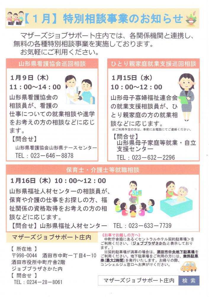 マザーズジョブサポート庄内では、各関係機関と連携し、各種特別相談事業を実施しております。ぜひ、ご利用ください。  山形県看護協会巡回相談 ※お申し込み不要日 時 1月9日(木)11:00〜14:00場 所 マザーズジョブサポート庄内 セミナールーム問合せ 山形県看護協会 пF023-646-8878HP:http://www.nurse-yamagata.or.jp/ 看護の仕事への復職をお考えの方、お気軽にご相談ください。   保育士・介護士等就職相談 ※お申し込み不要日 時 1月16日(木)10:00〜12:00場 所 マザーズジョブサポート庄内 セミナールーム 問合せ 山形県福祉人材センター пF023-633-7739HP:http://www.ymgt-shakyo.or.jp/jinzai/                保育士・介護士・看護師など資格をお持ちの方や、資格取得を目指している方、福祉職にご関心のある方はお気軽にお越しください。  ひとり親家庭就業支援相談 [要予約]日 時 1月15日(水)10:00〜12:00場 所 マザーズジョブサポート庄内 セミナールーム問合せ 山形県母子家庭等就業・自立支援センター пF023-632-2296HP:http://www.y-boshi.com/self-support/                  ひとり親家庭の方や今後について考えている方、どうぞお気軽にお越しください。 ※ご利用希望の方は、マザーズジョブサポート庄内へのご登録が必要となります。※ご相談の際、お子さまの託児は『保育ルームきらきら』をご利用いただけます。事前にご予約が必要です。  ※各相談会について、利用ご希望の方は、マザーズジョブサポート庄内 マザーズ・コンシェルジュまでお気軽にお声掛けください。※ご相談の際、お子さまの託児は『保育ルーム きらきら』をご利用いただけます。託児ルームのご利用には、事前のご登録が必要です。  【駐車場について】お車でお越しの際は、中町庁舎脇にある〈セントラルホテル契約駐車場〉をご利用ください。(ジョブプラザさかたと表示してあります。)※契約駐車場が満車の場合は、酒田市中央地下駐車場をご利用ください。酒田市中央地下駐車場をご利用の方は、無料駐車券(最大2時間)を発行いたします。お帰りの際に、コンシェルジュ窓口へお声がけください。 ◇お申込み・お問い合わせ◇マザーズジョブサポート庄内TEL:0234-28-8061