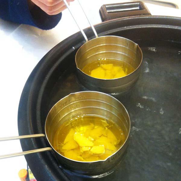 湯せんでオリーブオイル(オルチョ)と蜜蝋を溶かします。