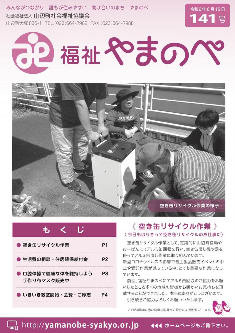 「福祉やまのべ141号」では、新型コロナウィルスの影響に伴う生活費に関する相談受付の情報や、住居確保給付金についての情報を掲載しております。またその他にも、●山辺町地域包括センターより「口腔体操で健康な体を維持しよう!」●あおぞらより空き缶リサイクル活動の様子●あおぞらにて手作りマスク販売中●介護予防教室「いきいき教室」はじまります●無料法律相談会を開催します●山辺町社会福祉協議会会費へのご協力のお礼●ご厚志ありがとうございましたといった情報を掲載しておりますのでどうぞご覧ください。→ 山辺町社会福祉協議会・広報誌141号(PDF)