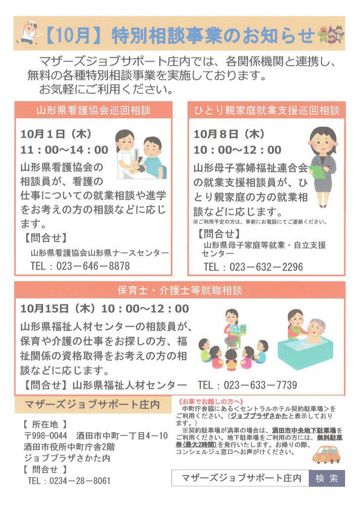 マザーズジョブサポート庄内では、各関係機関と連携し、各種特別相談事業を実施しております。ぜひ、ご利用ください。 山形県看護協会巡回相談 ※お申し込み不要日 時 10月1日(木)11:00〜14:00場 所 マザーズジョブサポート庄内 セミナールーム問合せ 山形県看護協会 пF023-646-8878HP:http://www.nurse-yamagata.or.jp/ 看護の仕事への復職をお考えの方、お気軽にご相談ください。 保育士・介護士等就職相談 ※お申し込み不要日 時 10月15日(木)10:00〜12:00場 所 マザーズジョブサポート庄内 セミナールーム問合せ 山形県福祉人材センター пF023-633-7739HP:http://www.ymgt-shakyo.or.jp/jinzai/保育士・介護士・看護師など資格をお持ちの方や、資格取得を目指している方、福祉職にご関心のある方は、お気軽にお越しください。 ひとり親家庭就業支援相談 [要予約]日 時 10月8日(木)10:00〜12:00場 所 マザーズジョブサポート庄内 セミナールーム問合せ 山形県母子家庭等就業・自立支援センター пF023-632-2296HP:http://www.y-boshi.com/self-support/ひとり親家庭の方や今後について考えている方、どうぞお気軽にお越しください。 ※各相談会について、利用ご希望の方は、マザーズジョブサポート庄内までお気軽にお声掛けください。※ご相談の際、お子さまの託児は『保育ルーム きらきら』をご利用いただけます。託児ルームのご利用には、事前のご登録が必要です。 【駐車場について】お車でお越しの際は、中町庁舎脇にある〈セントラルホテル契約駐車場〉をご利用ください。(ジョブプラザさかたと表示してあります。)※契約駐車場が満車の場合は、酒田市中央地下駐車場をご利用ください。無料駐車券(最大2時間)を発行いたします。お帰りの際に、コンシェルジュ窓口へお声がけください。 ◇お申込み・お問い合わせ◇マザーズジョブサポート庄内TEL:0234-28-8061