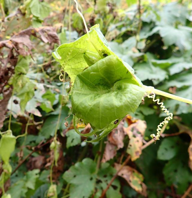 晩秋の寒いこの時季開花し、交配し、実を結ぶ。ミヤマニガウリの葉が短柄の房を作り両性花序を守り、育てる。世界初のミヤマニガウリ作る葉のenclosure