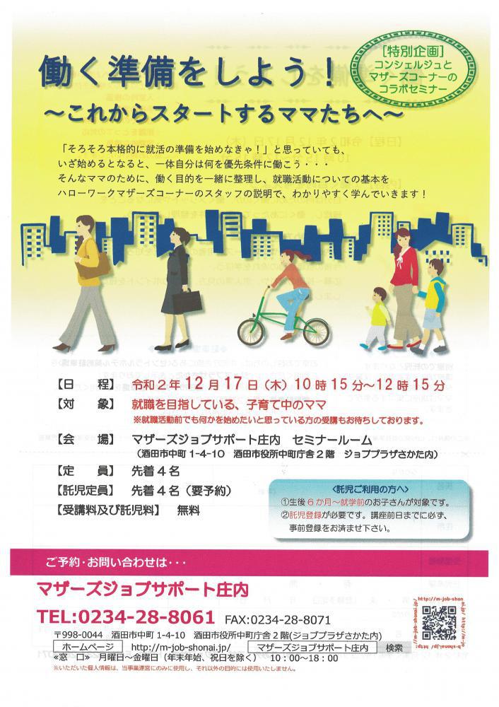☆コンシェルジュ&マザーズコーナーコラボセミナー☆『働く準備をしよう!〜これからスタートするママたちへ〜』のお知らせです。 「そろそろ本格的に就活の準備始めなきゃ!」と思っていても、自分の働く際の優先順位って…?など悩むことも多いはず。 そんなママのために働く目的を一緒に整理し就職活動の基本をハローワークマザーズコーナのスタッフの説明でわかりやすく学ぶことができます。 【日 時】12月17(木)10時15分〜12時15分【対 象】就職を目指している子育て中のママ※就職活動前で何かを始めたい方でもOK【会 場】マザーズジョブサポート庄内 セミナールーム【料 金】受講料 及び 託児料 無料【定 員】先着4名 ※お申込みが必要です。【託 児】定員4名 ※事前登録・予約が必要です。※併設の保育ルームで、保育スタッフがお子さんをお預かりします。ママは安心して受講いただけます。 【駐車場について】お車でお越しの際は、中町庁舎脇にある〈セントラルホテル契約駐車場〉をご利用ください。(ジョブプラザさかたと表示してあります。)※契約駐車場が満車の場合は、酒田市中央地下駐車場をご利用ください。ご利用の方は、無料駐車券(最大2時間)を発行いたします。お帰りの際にコンシェルジュ窓口へお声がけください。 ★★受講者の皆様へお願い★★新型コロナウイルス拡大防止のため、・入室時の検温・手指の消毒・会場でのマスク着用・距離をとっての対応・定期的な換気にご協力お願いいたします。★★ーーーーーーーーーーーー★★ どうぞ、お気軽にお問い合わせくださいね。 お問合せはマザーズジョブサポート庄内TEL:0234-28-8061FAX:0234-28-8071