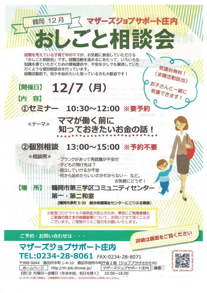 マザーズジョブサポート庄内『おしごと相談会』を開催します。 【日時と内容】■ 12月7日(月)10:30〜12:00 セミナー ※お申込みが必要です。「ママが働く前に知っておきたいお金の話!」社会保険のことや、年金のこと、「扶養の範囲内で働く」ということなどママが今後の働き方を考える上で大切な内容を社会保険労務士がお話します。13:00〜15:00 個別相談会※お申込みは不要です。・おしごとに関するお悩み・子育てに関すること・仕事と家事、子育てとの両立 など、お気軽にご相談ください。 【場 所】鶴岡市第三学区コミュニティセンター第一・第二和室 ♪お子さんと一緒に、お気軽にお越しください♪お子さんと同じお部屋でセミナーを受講し、相談することができます。保育スタッフが、お子さんを見守ります。 ★★受講者の皆様へお願い★★新型コロナウイルス拡大防止のため、・入室時の検温・手指の消毒・会場でのマスク着用・距離をとっての対応・定期的な換気にご協力お願いいたします。★★ーーーーーーーーーーーー★★ ◇お申込み・お問合せ◇マザーズジョブサポート庄内TEL:0234-28-8061