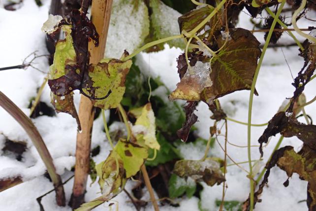 11/4 9;00 2℃ あられ、細雪時のミヤマニガウリです。みぞれ雪に合いベタ状です。交配は4〜5日前なので、結実し裂果も確認。温室形成の囲いの葉に注目してください。