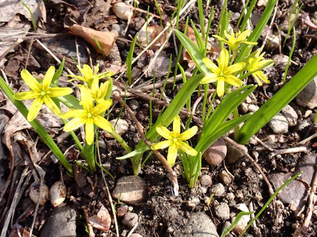 春先山形霞城公園のお堀がラン科のキバナノアマナで埋め尽くされる。艶のある線形の葉が花被片より伸びて光り輝いている。
