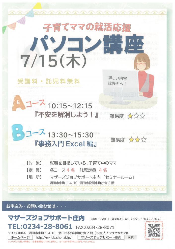 ☆マザーズジョブサポート庄内主催☆再就職応援『パソコン講座』のお知らせ ≪Aコース≫ 7月15日(木)10:15〜12:15『不安を解消しよう!』難易度:★「求人票の"パソコンが使える方"ってどの程度?」「仕事では、どのくらいのスキルが求められるの?」「WordとExcelって、どの程度使えると大丈夫?」などいろいろな不安がありますよね… パソコンについての"これから"を考えるきっかけに♪ ≪Bコース≫ 7月15日(金)13:30〜15:30『事務入門(Excel編)』難易度:★★事務のお仕事にも、一般・経理・労務など様々です。それぞれどのようなパソコン作業があるのかを確認していきます。実際にエクセルで、関数を利用し請求書を作成します。 ♪片方のコースのみ、両方のコース、どちらの受講でも可能です♪※本セミナーは「雇用保険受給中の求職活動実績」として認められます。 ★★受講者の皆様へお願い★★新型コロナウイルス拡大防止のため、・入室時の検温・手指の消毒・会場でのマスク着用・距離をとっての対応・定期的な換気にご協力お願いいたします。新型コロナウイルス感染症の影響により中止または延期となる場合があります。あらかじめ、ご了承ください。★★ーーーーーーーーーーーー★★【対 象】就職を目指している子育て中のママ※就職活動前で何かを始めたいママもOK【会 場】マザーズジョブサポート庄内 セミナールーム【料 金】受講料 及び 託児料 無料【定 員】先着4名 ※お申込みが必要です。【託 児】定員4名 ※事前登録・予約が必要です。 【駐車場について】お車でお越しの際は、中町庁舎脇にある〈セントラルホテル契約駐車場〉をご利用ください。(ジョブプラザさかたと表示してあります。)※契約駐車場が満車の場合は、酒田市中央地下駐車場をご利用ください。無料駐車券(最大2時間)を発行いたします。お帰りの際に、コンシェルジュ窓口へお声がけください。 ◇お申込み・お問い合わせ◇マザーズジョブサポート庄内TEL:0234-28-8061