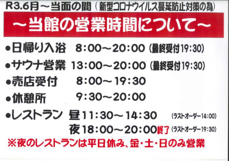 2021.6月1日(火)〜営業時間の変更のお知らせ新型コロナウイルス感染症蔓延防止対策のため、当面の間、営業時間を変更させて頂きます。営業時間 朝8時〜20時まで(最終受付19:30分)※夜のレストランは金・土・日のみ営業となります。ご了承下さいませ。