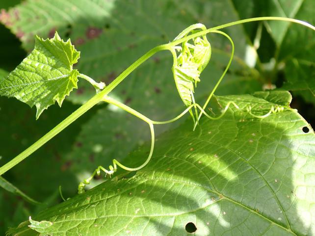 先端は巻きひげと複数の柔らかい若緑の葉が筒のようになって付くようになる。