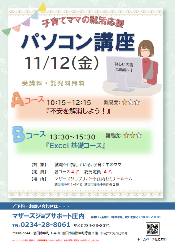 ☆マザーズジョブサポート庄内主催☆再就職応援『パソコン講座』のお知らせ ≪Aコース≫ 11月12日(金)10:15〜12:15『不安を解消しよう!』難易度:★「求人票の"パソコンが使える方"ってどの程度?」「仕事では、どのくらいのスキルが求められるの?」「WordとExcelって、どの程度使えると大丈夫?」などいろいろな不安がありますよね… パソコンについての"これから"を考えるきっかけに♪ ≪Bコース≫ 11月12日(金)13:30〜15:30『Excel基礎コース』難易度:★★Excelを初めて使う方や、久しぶりの方を対象に基本的な機能と操作方法をお伝えします。表の作成や編集、関数による計算、グラフの作成などを行います! ♪片方のコースのみ、両方のコース、どちらの受講でも可能です♪※本セミナーは「雇用保険受給中の求職活動実績」として認められます。 ★★受講者の皆様へお願い★★新型コロナウイルス拡大防止のため、・入室時の検温・手指の消毒・会場でのマスク着用・距離をとっての対応・定期的な換気にご協力お願いいたします。新型コロナウイルス感染症の影響により中止または延期となる場合がございます。あらかじめ、ご了承ください。★★ーーーーーーーーーーーー★★【対 象】就職を目指している子育て中のママ※就職活動前で何かを始めたいママもOK【会 場】マザーズジョブサポート庄内 セミナールーム【料 金】受講料 及び 託児料 無料【定 員】先着4名 ※お申込みが必要です。【託 児】定員4名 ※事前登録・予約が必要です。 【駐車場について】お車でお越しの際は、中町庁舎脇にある〈セントラルホテル契約駐車場〉をご利用ください。(ジョブプラザさかたと表示してあります。)※契約駐車場が満車の場合は、酒田市中央地下駐車場をご利用ください。無料駐車券(最大2時間)を発行いたします。お帰りの際に、コンシェルジュ窓口へお声がけください。 ◇お申込み・お問い合わせ◇マザーズジョブサポート庄内TEL:0234-28-8061メールでのお申込みはコチラ